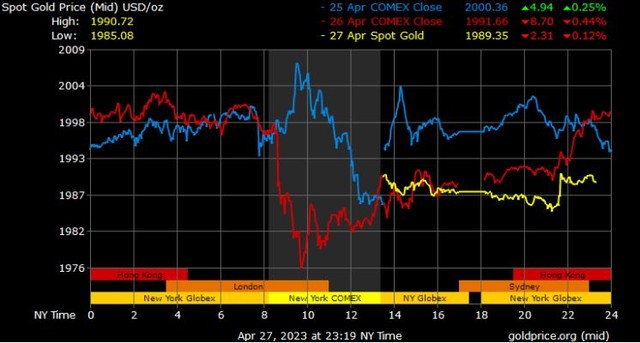 Giá vàng tương lai giao tháng 6/2023 trên sàn Comex New York tăng 3 USD, tương ứng tăng 0,15% xuống 1.999 USD/ounce.
