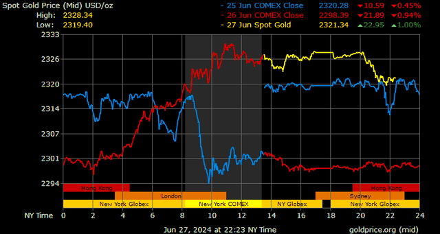 Giá vàng tương lai giao tháng 8/2024 trên sàn Comex New York tăng 23,4 USD, tương ứng tăng 1,01% lên mức 2.336,6 USD/ounce.
