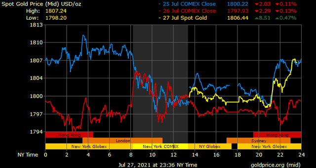 Giá vàng tương lai giao tháng 8 trên sàn Comex New York tăng hơn 7 USD lên 1.807,2 USD/ounce.