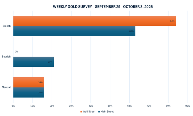 Khảo sát vàng hàng tuần mới nhất của Kitco News cho thấy tâm lý của Phố Wall lạc quan hơn bao giờ hết sau khi giá vàng tăng bất chấp nhiều trở ngại, trong khi các nhà đầu tư Main Street trở nên lạc quan hơn một chút về triển vọng ngắn hạn của kim loại quý này.