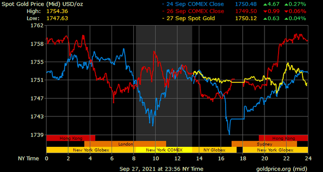 Trên thị trường vàng thế giới, giá vàng giao ngay chốt phiên đêm qua tại Mỹ giảm 0,5 USD xuống 1.749,7 USD/ounce. Sang phiên châu Á sáng nay, giá vàng gần như đi ngang quanh ngưỡng trên.