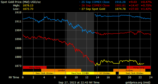 Vàng giảm mạnh chạm mức thấp nhất trong 6,5 tháng và thủng mức hỗ trợ tâm lý 1.900 USD/ounce khi chỉ số đô la Mỹ có xu hướng tăng đạt mức cao nhất trong 10 tháng và lãi suất trái phiếu kho bạc Mỹ kỳ hạn 10 năm cao nhất trong 16 năm.