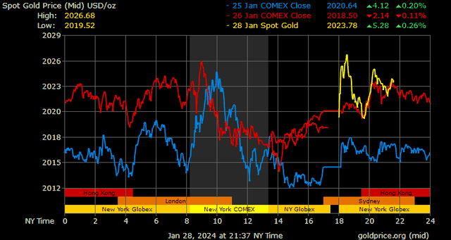 Giá vàng tương lai giao tháng 2/2024 trên sàn Comex New York giảm 0,05 USD, tương ứng giảm 0,02% xuống mức 2.017,3 USD/ounce.