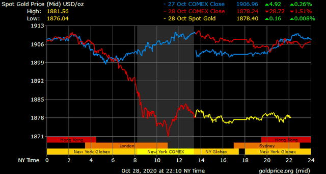 Trên thị trường vàng thế giới, giá vàng giao ngay chốt phiên đêm qua tại Mỹ giảm 31,1 USD xuống 1.876,5 USD/ounce. Sang phiên châu Á sáng nay, giá vàng gần như đi ngang quanh mức giá trên. Giá vàng tương lai giao tháng 11 trên sàn Comex New York giảm 0,1 USD xuống 1.876,4 USD/ounce.