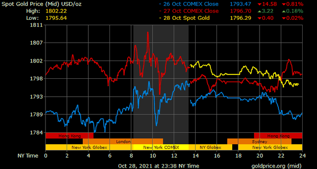 Trên thị trường vàng thế giới, giá vàng giao ngay chốt phiên đêm qua tại Mỹ tăng 2,1 USD lên 1.799,1 USD/ounce. Sang phiên châu Á sáng nay, giá vàng lùi nhẹ về gần 1.795 USD/ounce.