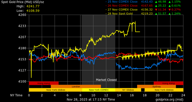 Trên thị trường vàng thế giới, giá vàng giao ngay chốt phiên hôm qua tại Mỹ tăng 57 USD, tương ứng tăng 1,37% lên mức 4.215,8 USD/ounce.