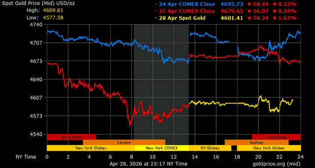 Trên thị trường vàng thế giới, giá vàng giao ngay chốt phiên hôm qua tại Mỹ giảm 85,2 USD, tương ứng giảm 1,82% xuống mức 4.596,8 USD/ounce. Sang phiên châu Á sáng nay, giá vàng đảo chiều tăng nhẹ 4,8 USD lên mức 4.601,6 USD/ounce.