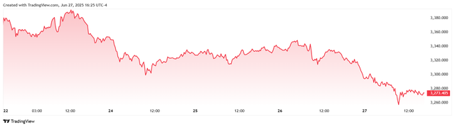 Trên thị trường vàng thế giới, giá vàng giao ngay chốt phiên hôm qua tại Mỹ giảm mạnh 53,6 USD xuống 3.274,2 USD/ounce.