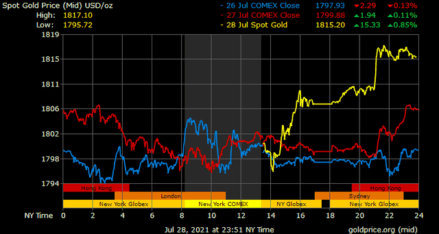 Trên thị trường vàng thế giới, giá vàng giao ngay chốt phiên đêm qua tại Mỹ tăng 8,8 USD lên 1.807,5 USD/ounce. Sang phiên châu Á sáng nay, giá vàng vọt lên trên 1.815 USD/ounce.