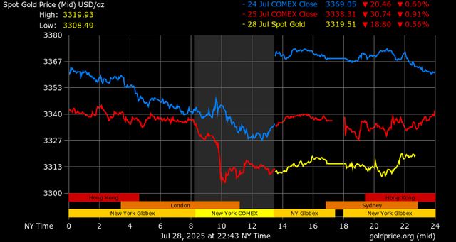 Giá vàng tương lai giao tháng 8/2025 trên sàn Comex New York giảm 25,6 USD, tương ứng giảm 0,77% xuống mức 3.310 USD/ounce.