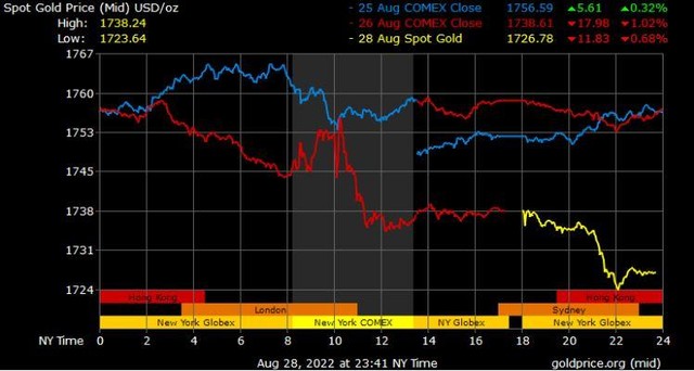 Giá vàng tương lai giao tháng 10/2022 trên sàn Comex New York giảm 21,2 USD xuống 1.740,6 USD/ounce.
