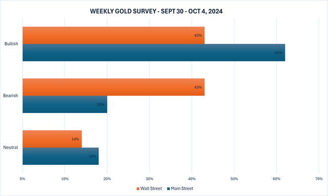 Tuần này, 14 nhà phân tích đã tham gia Khảo sát vàng của Kitco News, với Phố Wall đạt được sự cân bằng giữa lạc quan và bi quan về diễn biến giá. Sáu chuyên gia, hay 43%, dự kiến giá vàng sẽ tăng trong tuần tới, trong khi sáu chuyên gia khác dự đoán giá kim loại quý này sẽ giảm. Hai nhà phân tích còn lại, hay 14%, tin rằng vàng sẽ giao dịch ngang vào tuần tới.