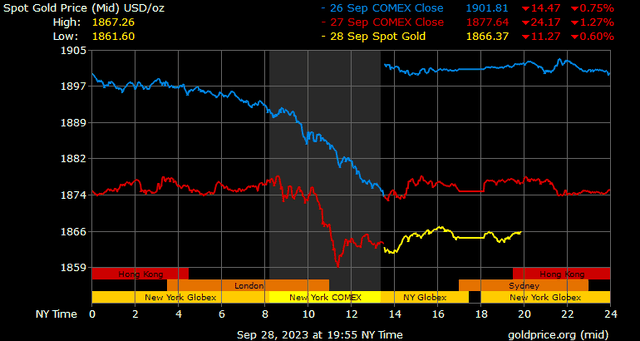 Giá vàng tương lai giao tháng 12/2023 trên sàn Comex New York giảm 12,3 USD, tương ứng giảm 0,65% xuống 1.878,6 USD/ounce.
