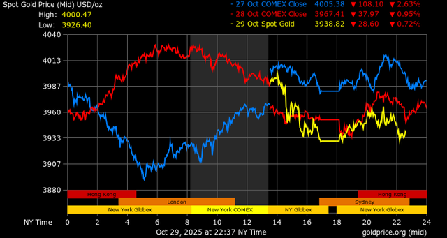 Trên thị trường vàng thế giới, giá vàng giao ngay chốt phiên hôm qua tại Mỹ giảm 22,4 USD, tương ứng giảm 0,57% xuống mức 3.930,6 USD/ounce. Sang phiên châu Á sáng nay, giá vàng đảo chiều tăng nhẹ 8,1 USD lên 3.938,7 USD/ounce.