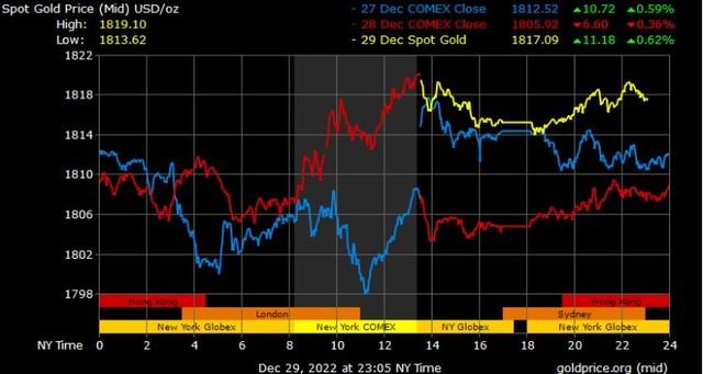 Giá vàng tương lai giao tháng 2/2023 trên sàn Comex New York tăng 10,2 USD lên 1.826 USD/ounce.