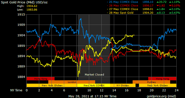 Giá vàng thế giới phiên ngày thứ Sáu tăng trở lại lên trên mốc tâm lý 1.900 USD/ounce, khi Mỹ công bố lạm phát tháng 4 vừa qua tăng lên mức 3,1%. Giá vàng vốn nhạy cảm với lạm phát, khi lạm phát có dấu hiệu đi len, ngay lập tức lực mua trú ẩn vào vàng sẽ gia tăng.