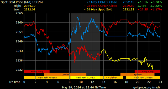 Giá vàng tương lai giao tháng 6/2024 trên sàn Comex New York giảm 15,3 USD, tương ứng giảm 0,65% xuống mức 2.341,2 USD/ounce.