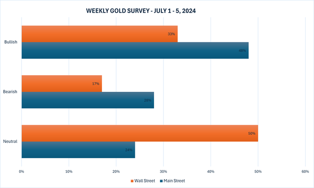 Tuần này, 12 nhà phân tích Phố Wall đã tham gia Khảo sát Vàng của Kitco News và sự đồng thuận cho tuần tới là sự thận trọng là phần tốt hơn của lòng dũng cảm. Bốn chuyên gia, chiếm 33%, dự kiến giá vàng sẽ tăng cao hơn vào tuần tới, trong khi hai nhà phân tích, hay 17%, dự đoán giá sẽ giảm. Sáu chuyên gia còn lại, chiếm chính xác 50% tổng số, không muốn tin tưởng vào hướng đi của vàng trong tuần tới.