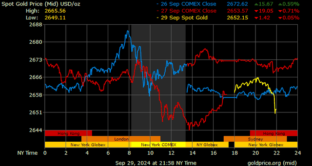Trên thị trường vàng thế giới, giá vàng giao ngay chốt phiên cuối tuần qua tại Mỹ giảm 13,9 USD xuống 2.658,4 USD/ounce. Sang phiên châu Á sáng nay, giá vàng tiếp tục giảm 6,4 USD xuống 2.652,1 USD/ounce.