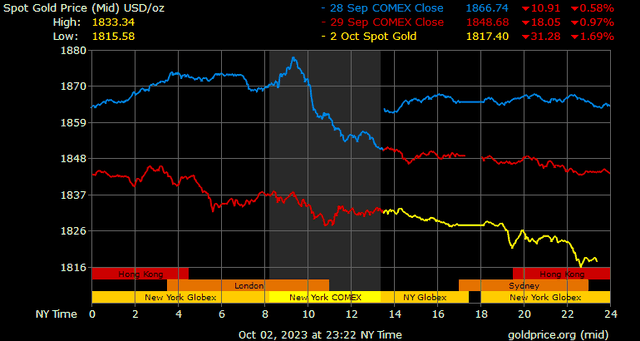 Vàng tiếp tục giảm với giá vàng tương lai tháng 12 chạm mức thấp nhất trong 10 tháng khi đồng đô la Mỹ đạt mức cao nhất trong 10 tháng và lãi suất trái phiếu kho bạc Hoa Kỳ tăng lên cao nhất trong 16 năm. Xu hướng giảm giá kim loại quý đang chiếm ưu thế và đang bị bán quá mức về mặt kỹ thuật.