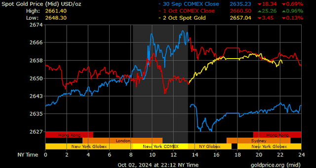 Trên thị trường vàng thế giới, giá vàng giao ngay chốt phiên hôm qua tại Mỹ giảm 4,9 USD xuống 2.658,8 USD/ounce. Sang phiên châu Á sáng nay, giá vàng tiếp tục giảm nhẹ 2,3 USD xuống 2.656,5 USD/ounce.