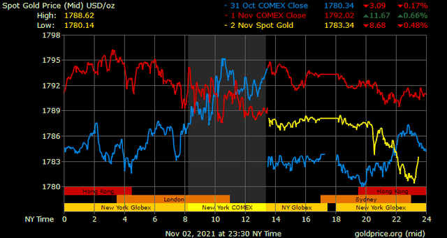 Trên thị trường vàng thế giới, giá vàng giao ngay chốt phiên đêm qua tại Mỹ giảm 5,8 USD xuống 1.787,7 USD/ounce. Sang phiên châu Á sáng nay, giá vàng giảm nhanh xuống gần 1.780 USD/ounce.