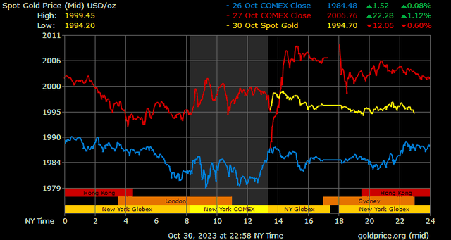 Giá vàng tương lai giao tháng 12/2023 trên sàn Comex New York tăng 7,1 USD, tương ứng tăng 0,36% lên 2.005,6 USD/ounce.