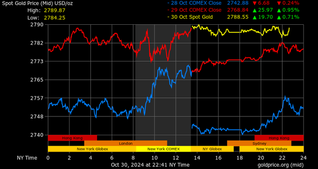 Các nhà phân tích lưu ý rằng vàng đang được chào mua do nhu cầu trú ẩn an toàn tăng lên trước cuộc bầu cử Tổng thống Hoa Kỳ vào tuần tới. Các nhà đầu tư đang phòng ngừa trước sự bất ổn chính trị gia tăng vì các cuộc thăm dò cho thấy cuộc bầu cử là một sự cân bằng.