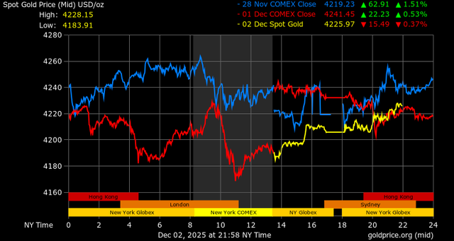 Giá vàng tương lai giao tháng 2/2026 trên sàn Comex New York giảm 54 USD, tương ứng giảm 1,26% xuống mức 4.220,8 USD/ounce.
