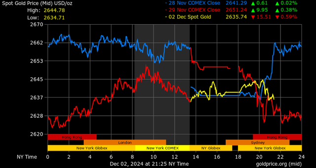 Giá vàng tương lai giao tháng 2/2025 trên sàn Comex New York giảm 22,5 USD, tương ứng giảm 0,84% xuống mức 2.658,5 USD/ounce.