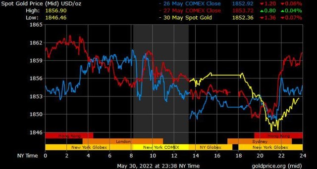 Giá vàng đã giảm từ mức cao nhất qua đêm nhưng tiếp tục giữ mức hỗ trợ trên 1.850 USD/ounce. Các nhà phân tích hàng hóa lưu ý rằng, thị trường nhìn chung thiếu thuyết phục về bất kỳ hướng nào khi thị trường Hoa Kỳ đóng cửa vào cuối tuần dài của Ngày Tưởng niệm.