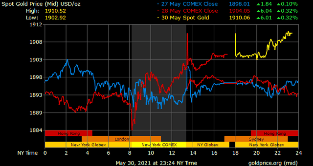 Giá vàng thế giới phiên ngày thứ Sáu tăng trở lại lên trên 1.900 USD/ounce, khi Mỹ công bố lạm phát tháng 4 tăng lên mức 3,1%. Giá vàng vốn nhạy cảm với lạm phát, khi lạm phát có dấu hiệu đi lên, ngay lập tức lực mua trú ẩn vào vàng sẽ gia tăng.