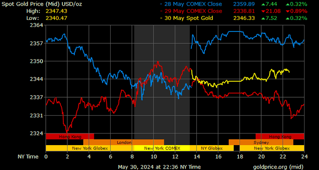 Trên thị trường vàng thế giới, giá vàng giao ngay chốt phiên hôm qua tại Mỹ tăng 5,2 USD lên 2.343,3 USD/ounce. Sang phiên châu Á sáng nay, giá vàng tiếp tục tăng nhẹ 3,1 USD lên 2.346,4 USD/ounce.