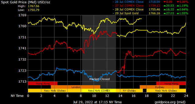 Giá vàng tương lai giao tháng 8/2022 trên sàn Comex New York tăng 12,6 USD lên 1.762,9 USD/ounce. Tính chung cả tuần, giá vàng giao ngay tăng 35,5 USD/ounce, tương ứng tăng 2,06%.