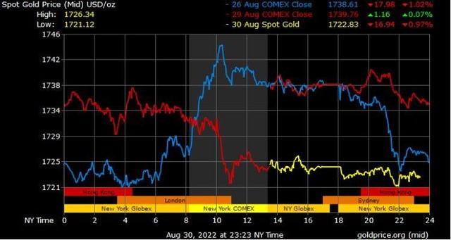 Giá vàng tương lai giao tháng 10/2022 trên sàn Comex New York giảm 13,6 USD xuống 1.726,9 USD/ounce.