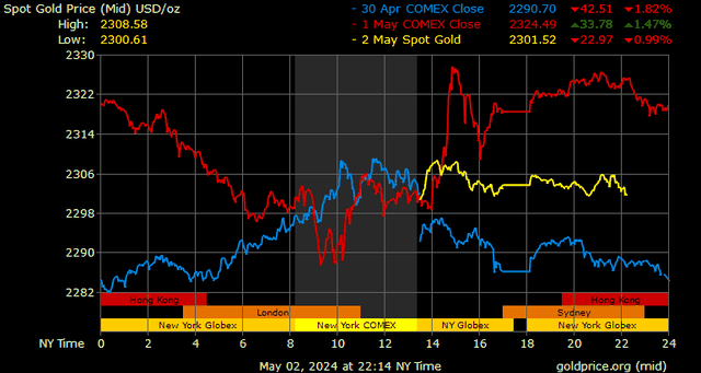 Hiện vàng không có nhiều biến động và đang giữ mức hỗ trợ trên 2.300 USD/ounce khi Fed giữ nguyên lãi suất như dự đoán rộng rãi và báo hiệu khả năng tiếp tục tạm dừng, làm giảm kỳ vọng về lãi suất cao hơn trong thời gian dài hơn của Mỹ.