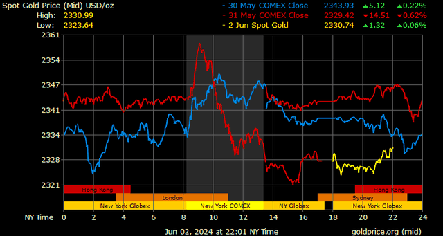 Giá vàng tương lai giao tháng 8/2024 trên sàn Comex New York giảm 20,7 USD, tương ứng giảm 0,87% xuống mức 2.345,8 USD/ounce.