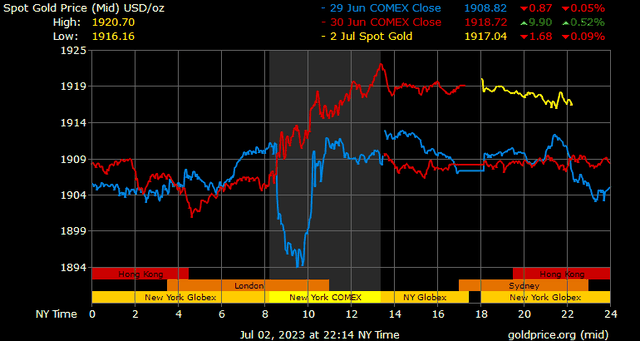Giá vàng tương lai giao tháng 8/2023 trên sàn Comex New York tăng 11,5 USD, tương ứng tăng 0,6% xuống 1.929,4 USD/ounce.