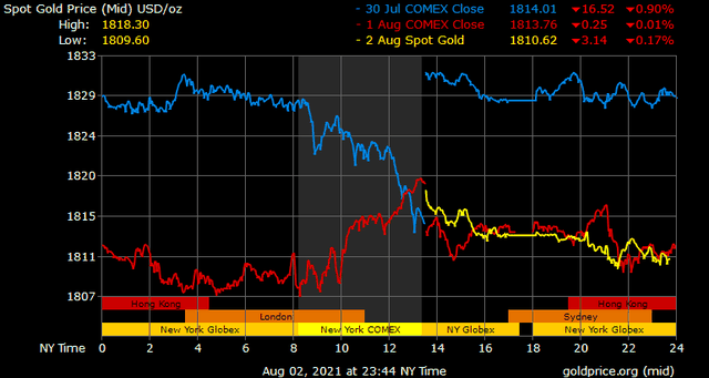Giá vàng tương lai giao tháng 9 trên sàn Comex New York giảm 8,4 USD xuống 1.810,3 USD/ounce.