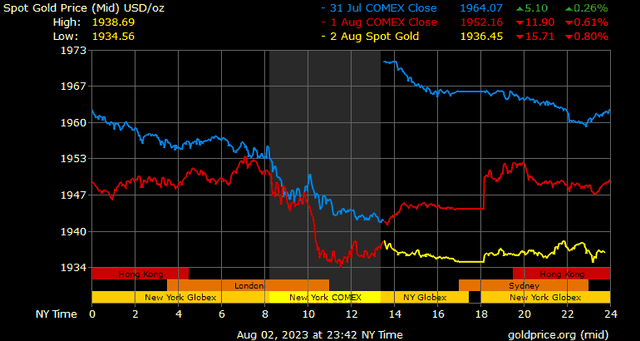 Việc sớm mua các kim loại quý làm nơi trú ẩn an toàn sau khi bất ngờ hạ bậc tín nhiệm nợ của chính phủ Hoa Kỳ đã nhường chỗ cho áp lực bán do chỉ số đồng đô la Mỹ tăng lên mức cao nhất trong ba tuần, lợi suất trái phiếu kho bạc Hoa Kỳ tăng và hoạt động bán tháo dầu thô thị trường dầu mỏ, đã khiến giá vàng đảo chiều điều chỉnh nhẹ.