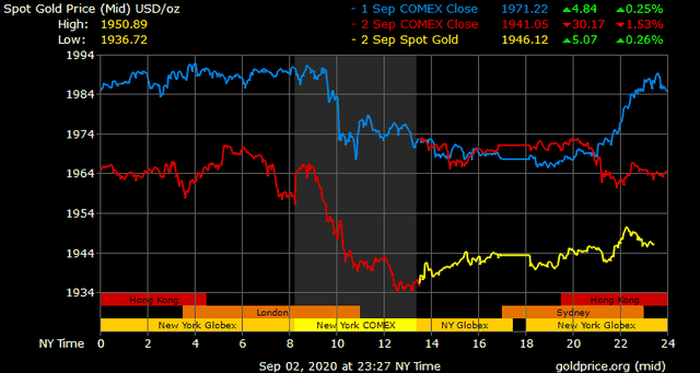 Trên thị trường vàng thế giới, giá vàng giao ngay chốt phiên đêm qua tại Mỹ giảm 26,7 USD xuống 1.943,1 USD/ounce. Sang phiên châu Á sáng nay, giá vàng tăng trở lại lên 1.945 USD/ounce. Giá vàng tương lai giao tháng 10 trên sàn Comex New York tăng 7,9 USD lên 1.944,8 USD/ounce.