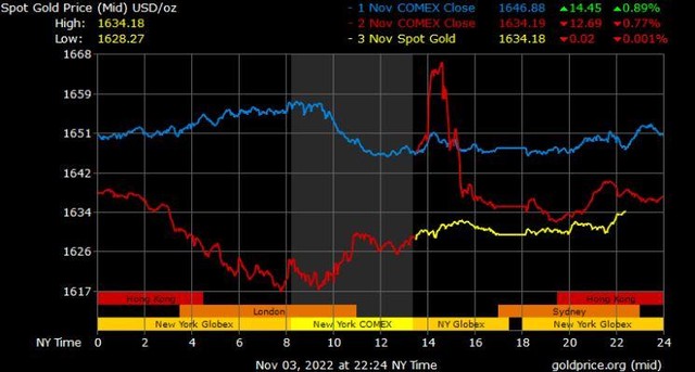 Giá vàng tương lai giao tháng 12/2022 trên sàn Comex New York giảm 19,1 USD lên mức 1.630,9 USD/ounce.
