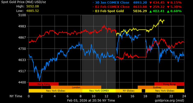 Trên thị trường vàng thế giới, giá vàng giao ngay chốt phiên hôm qua tại Mỹ tăng 285,8 USD, tương ứng tăng 6,13% lên mức 4.946,8 USD/ounce. Sang phiên châu Á sáng nay, giá vàng tiếp tục tăng 95,4 USD lên mức 5.042,2 USD/ounce.