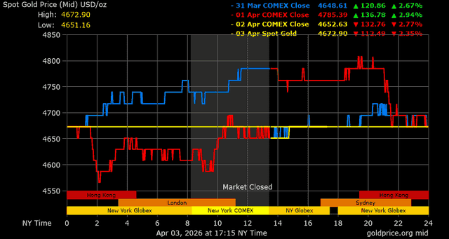 Giá vàng tương lai giao tháng 6/2026 trên sàn Comex New York kết phiên cuối tuần giảm 133,4 USD, tương ứng giảm 2,77% xuống mức 4.679,7 USD/ounce.