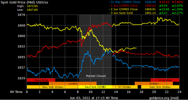 Giá vàng tương lai giao tháng 8/2022 trên sàn Comex New York giảm 21,2 USD xuống 1.850,2 USD/ounce.
