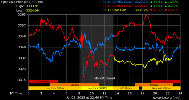 Giá vàng tương lai giao tháng 8/2025 trên sàn Comex New York giảm 16,8 USD, tương ứng giảm 0,5% xuống mức 3.342,9 USD/ounce.