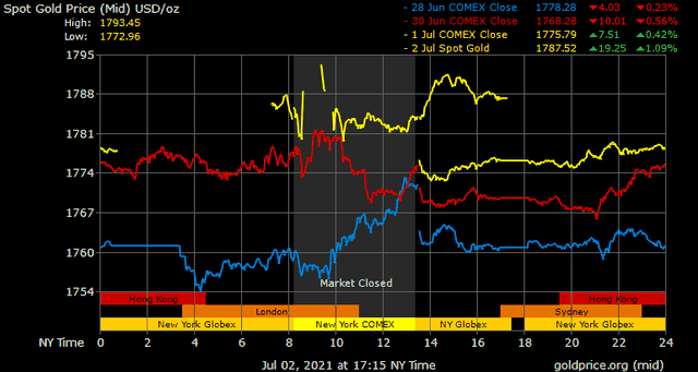 Trên thị trường vàng thế giới, giá vàng giao ngay chốt phiên đêm qua tại Mỹ tăng 10,6 USD lên 1.787,3 USD/ounce. Giá vàng tương lai giao tháng 8 trên sàn Comex New York tăng 10,9 USD lên 1.787,7 USD/ounce.