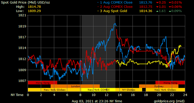 Giá vàng tương lai giao tháng 9 trên sàn Comex New York tăng 3,6 USD lên 1.814,3 USD/ounce.