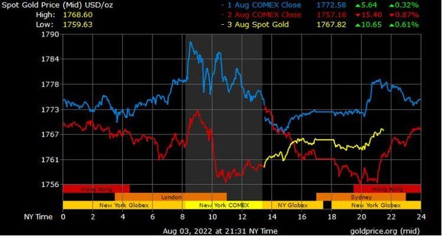 Giá vàng tương lai giao tháng 10/2022 trên sàn Comex New York giảm 13,6 USD xuống 1.766,1 USD/ounce.