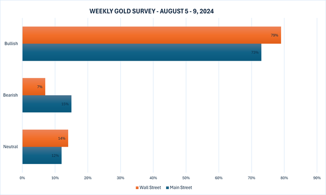 Tuần này, 14 nhà phân tích đã tham gia Khảo sát vàng của Kitco News, với sự lạc quan của Phố Wall về vàng tăng vọt sau khi cổ phiếu bị chao đảo giữa các mối đe dọa kinh tế và địa chính trị. Mười một chuyên gia, chiếm tới 79% tổng số, dự kiến giá vàng sẽ tăng thêm vào tuần tới, trong khi chỉ có một người, hay 7%, dự đoán giá sẽ giảm. Hai nhà phân tích còn lại, hay 14%, dự đoán giá vàng sẽ đi ngang trong tuần tới.